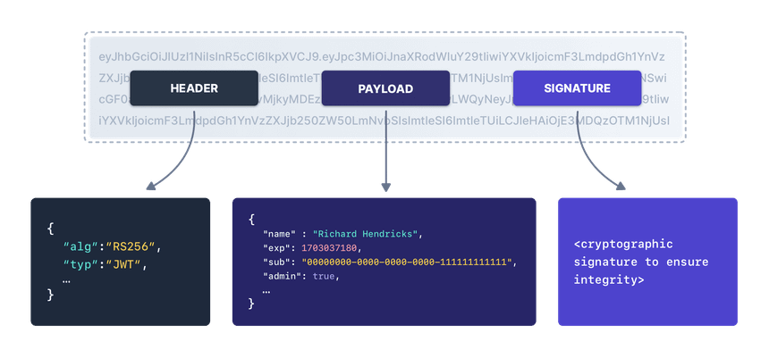 A JWT has three sections: a header, a payload, and a signature. Each sections are separated by periods. A typical JWT looks like this: